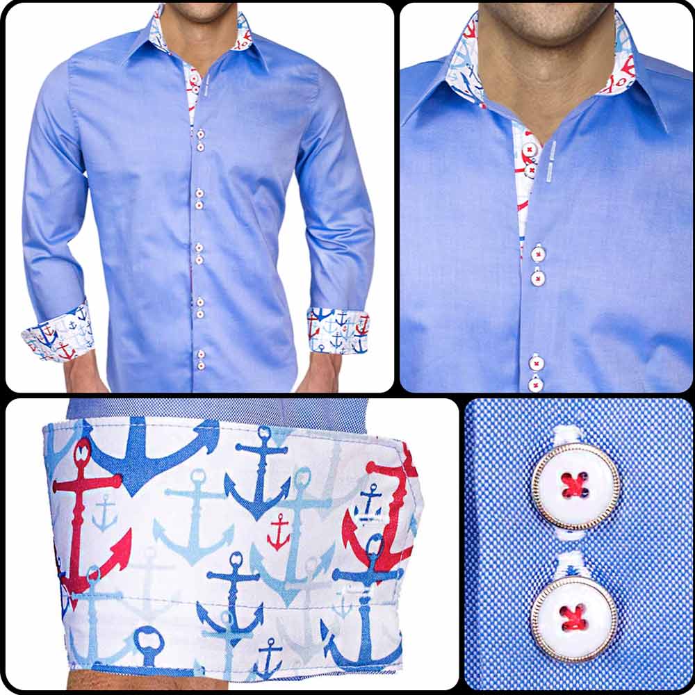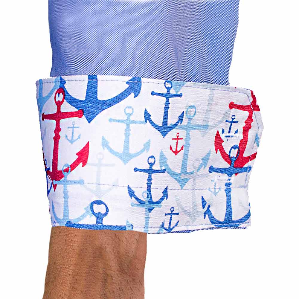 - Accent Fabric: White with blue and red anchors contrast fabric handcrafted in the inner collar band, down the button side placket, and inside the cuffs.