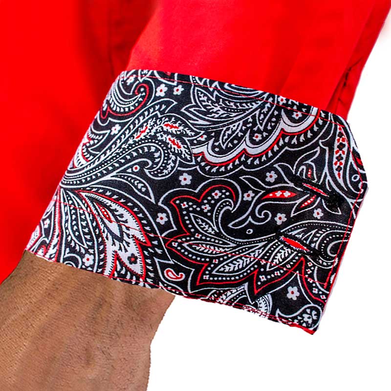 - Accent Fabric: Black, red, and white paisley fabric handcrafted in the inner collar band, down the button side placket, and inside the cuffs.