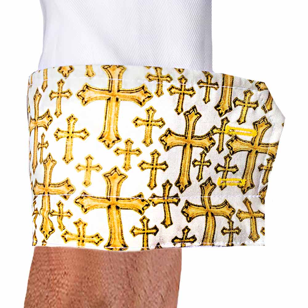 - Accent Fabric: White with gold metallic crosses contrast fabric handcrafted in the inner collar band, down the button side placket, and inside the cuffs.