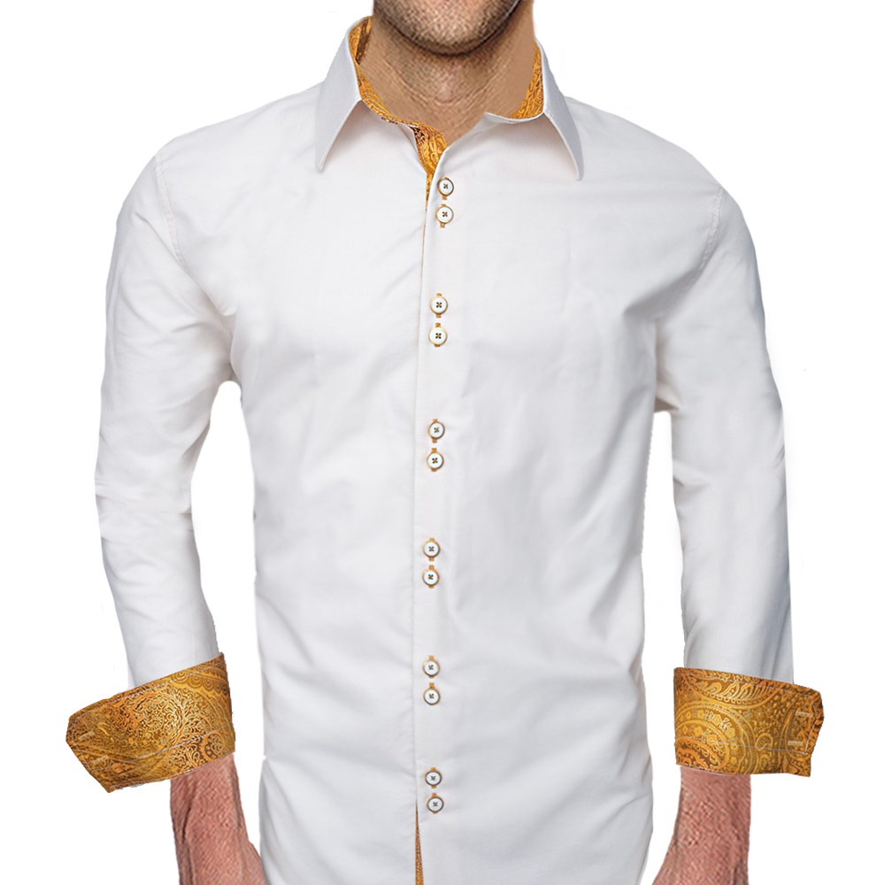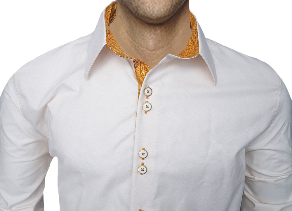 - Accent Fabric: Metallic gold paisley accent fabric handcrafted in the inner collar band, down the button side placket, and inside the cuffs.
