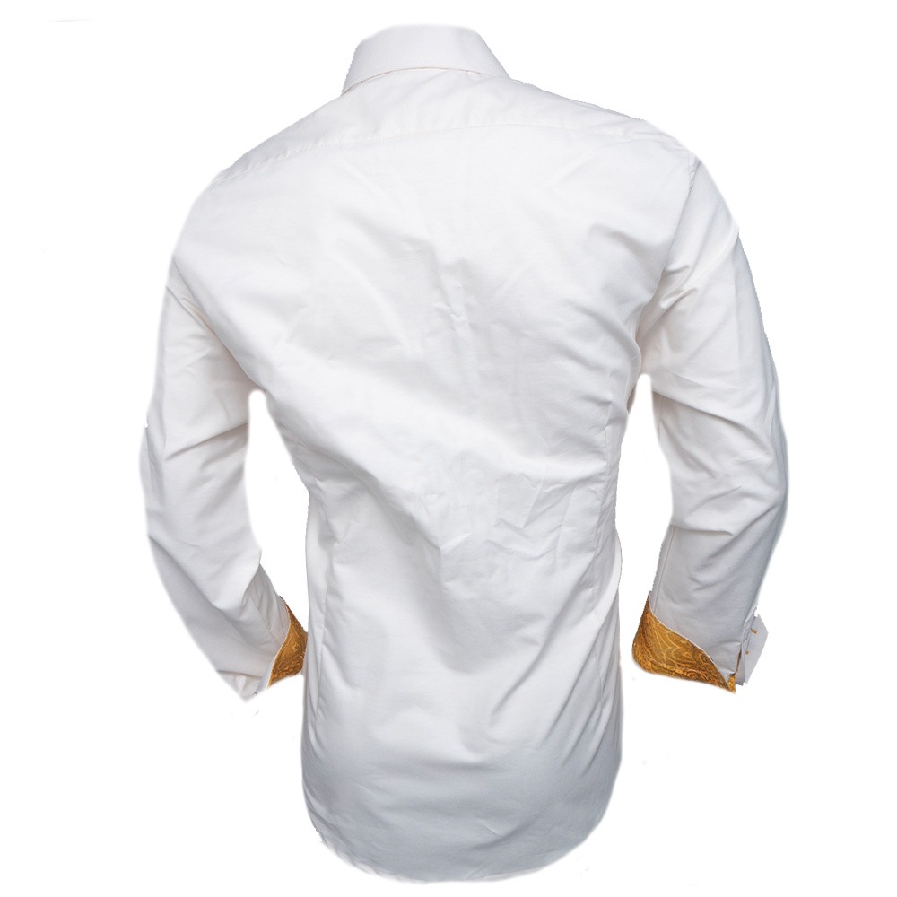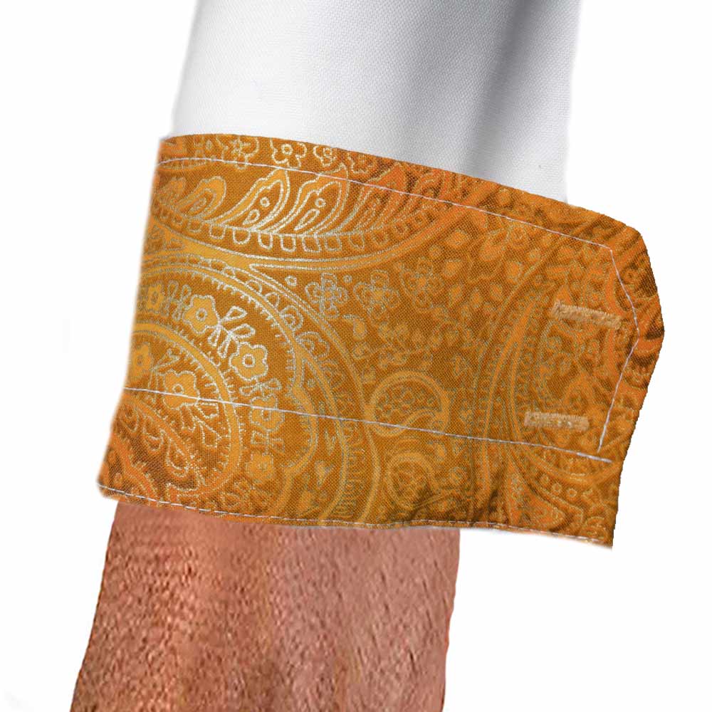 All of our Gold Paisley Dress Shirts are hand cut manually to ensure perfect symmetry of the fabric for accurate sizing. All of our fine fabrics are imported from Italy, England, Turkey, and Japan. Every single dress shirt is proudly made in the USA.