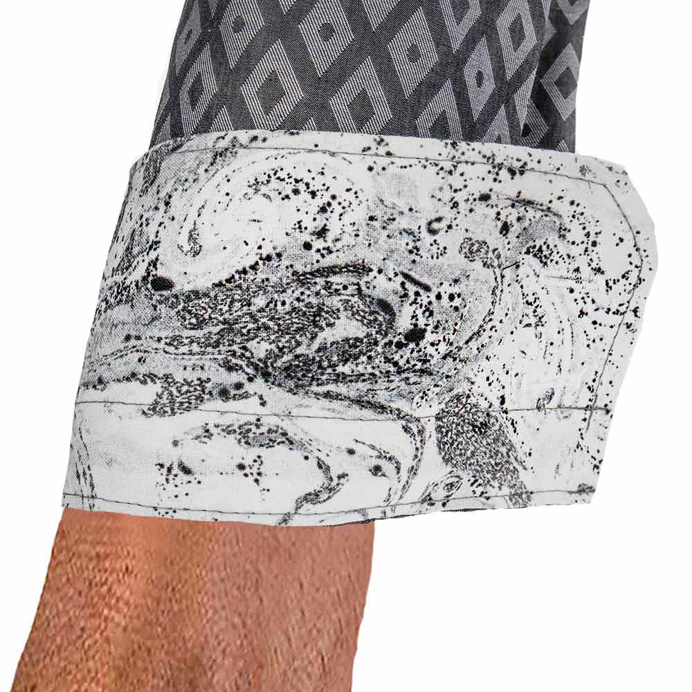 - Accent Fabric: Grey and white marble fabric handcrafted in the inner collar band, down the button side placket, and inside the cuffs.
