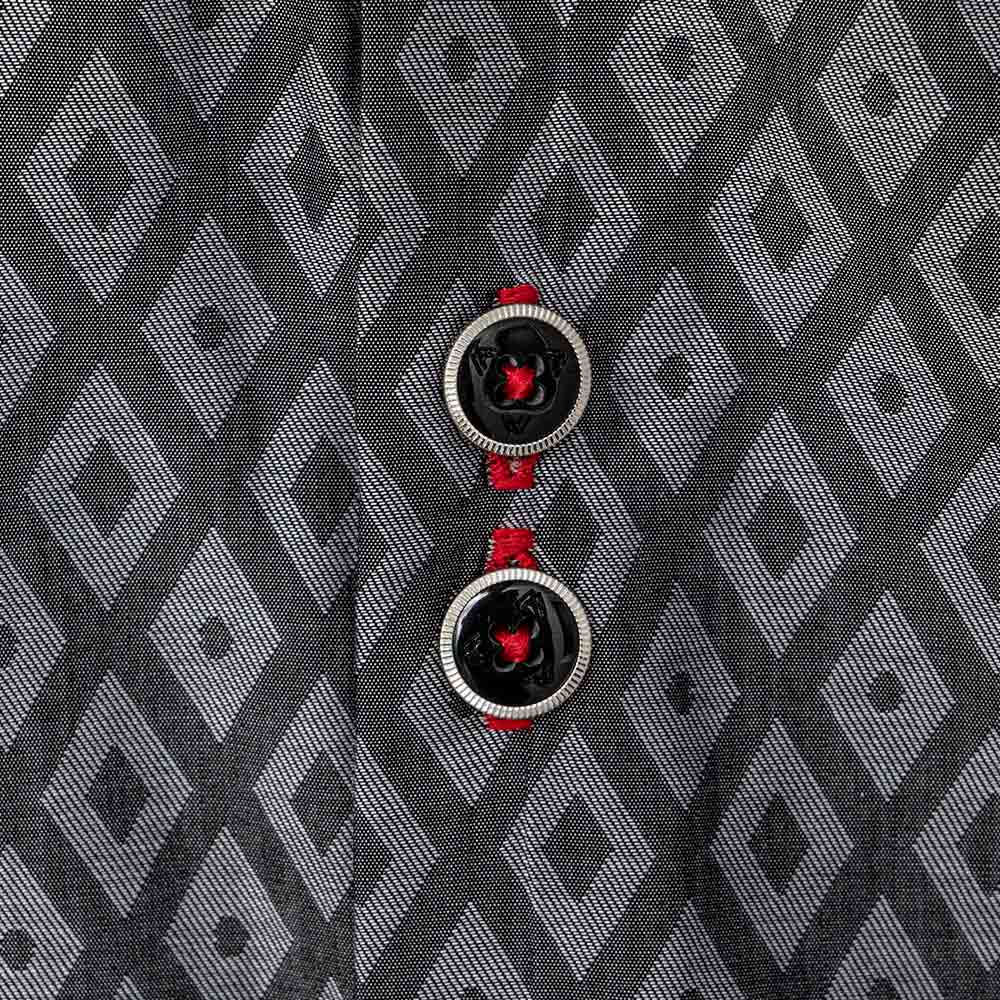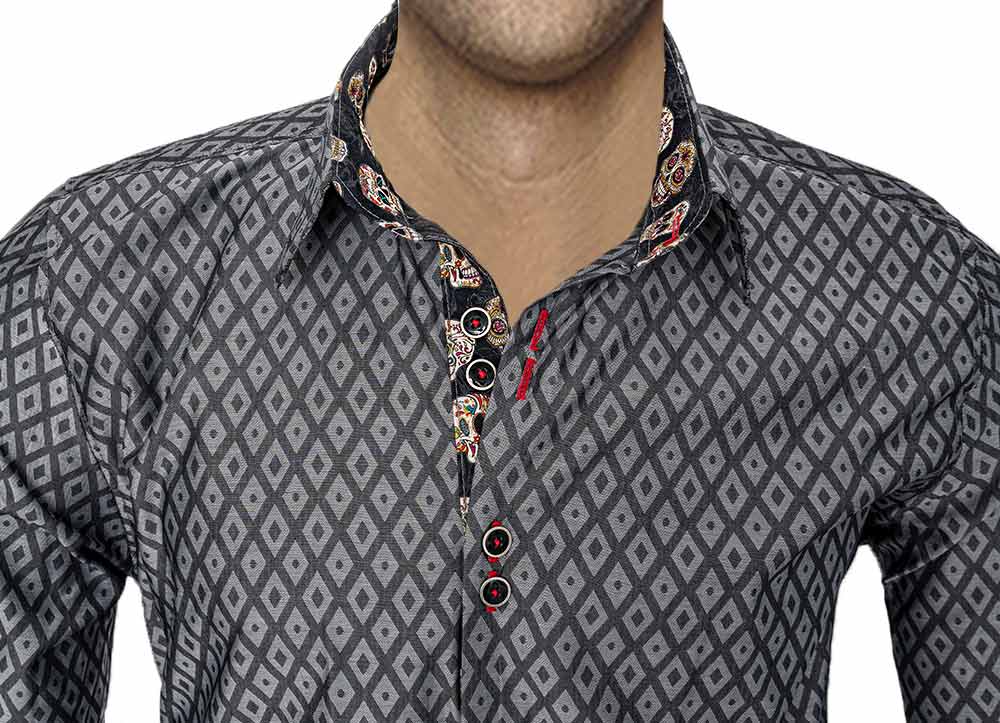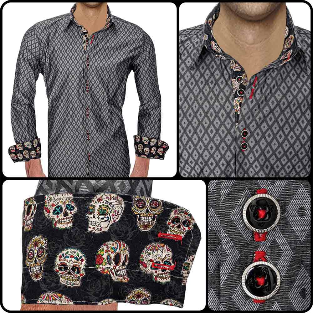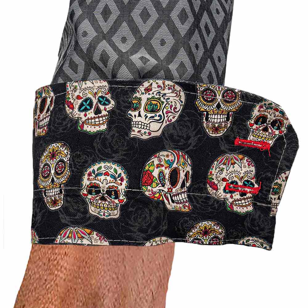 - Accent Fabric: bright skull accent fabric handcrafted in the inner collar band, down the button side placket, and inside the cuffs.