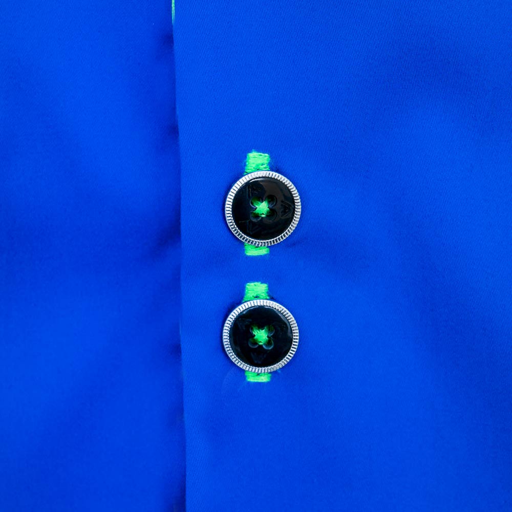 All of our Navy Blue Neon Green Dress Shirts are hand cut manually to ensure perfect symmetry of the fabric for accurate sizing. All of our fine fabrics are imported from Italy, England, Turkey, and Japan. Every single dress shirt is proudly made in the USA.