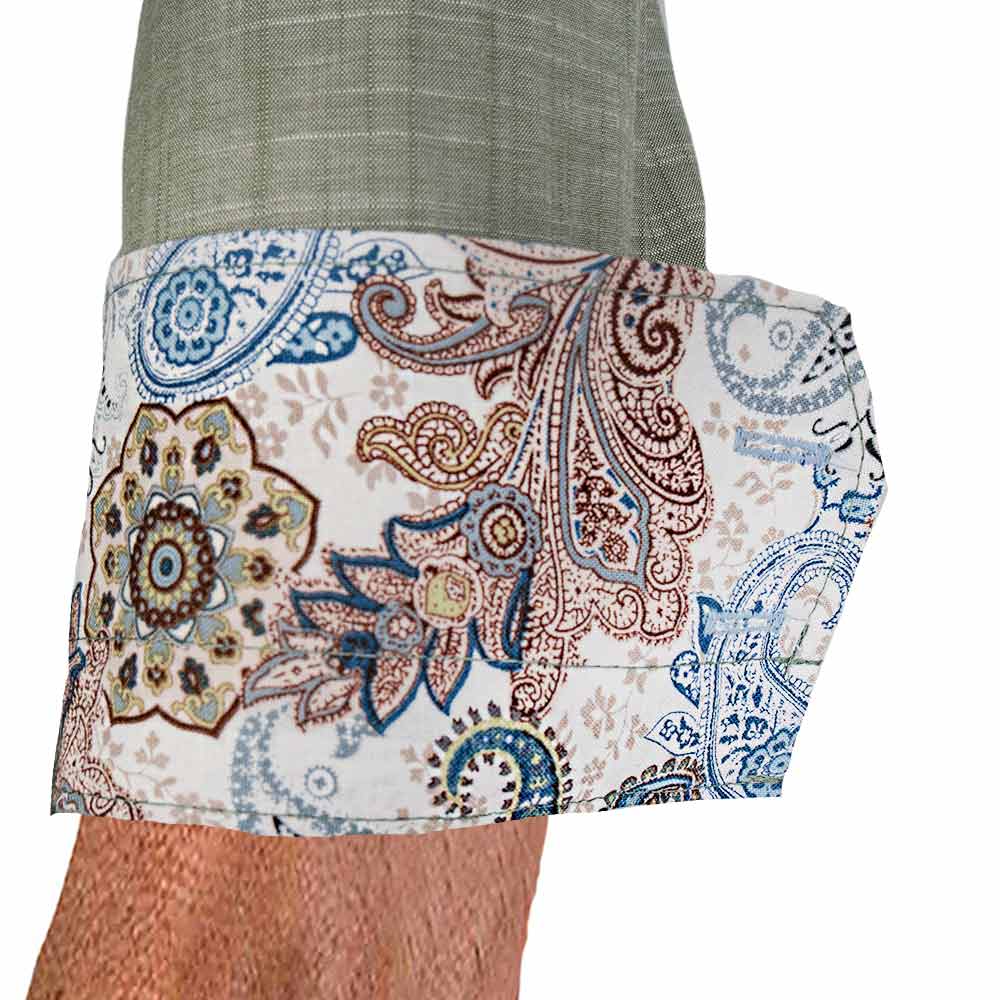 - Accent Fabric: Multi colored paisley fabric handcrafted in the inner collar band, down the button side placket, and inside the cuffs.