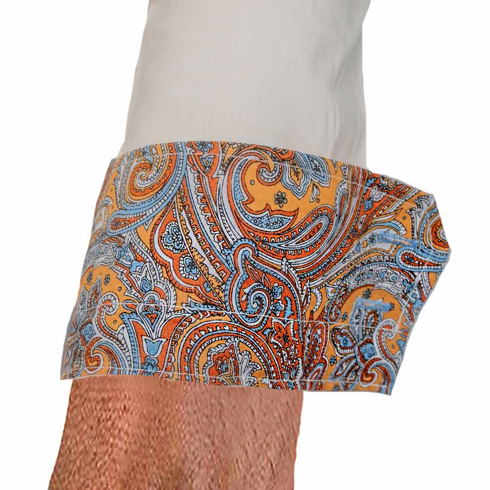 - Accent Fabric: blue and brown paisley colored accent fabric handcrafted in the inner collar band, down the button side placket, and inside the cuffs.