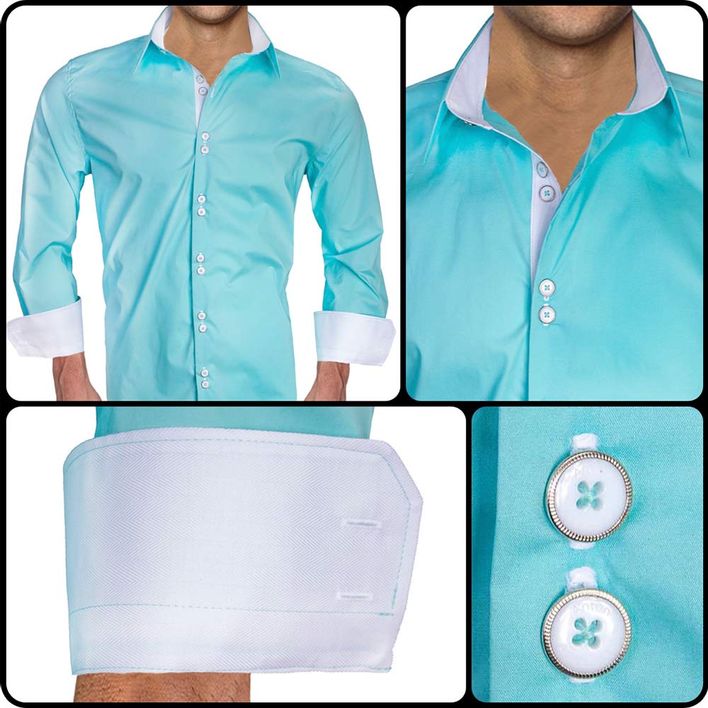 All of our Teal White Dress Shirts are hand cut manually to ensure perfect symmetry of the fabric for accurate sizing. All of our fine fabrics are imported from Italy, England, Turkey, and Japan. Every single dress shirt is proudly made in the USA.